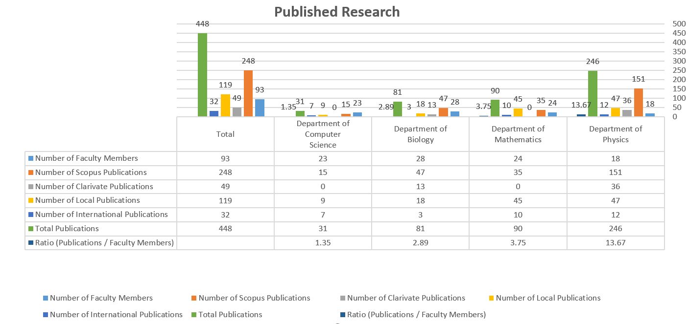 | Scientific Department | Number of Faculty Members | Number of Scopus Publications | Number of Clarivate Publications | Number of Local Publications | Number of International Publications | Total Publications | Ratio (Publications / Faculty Members) |