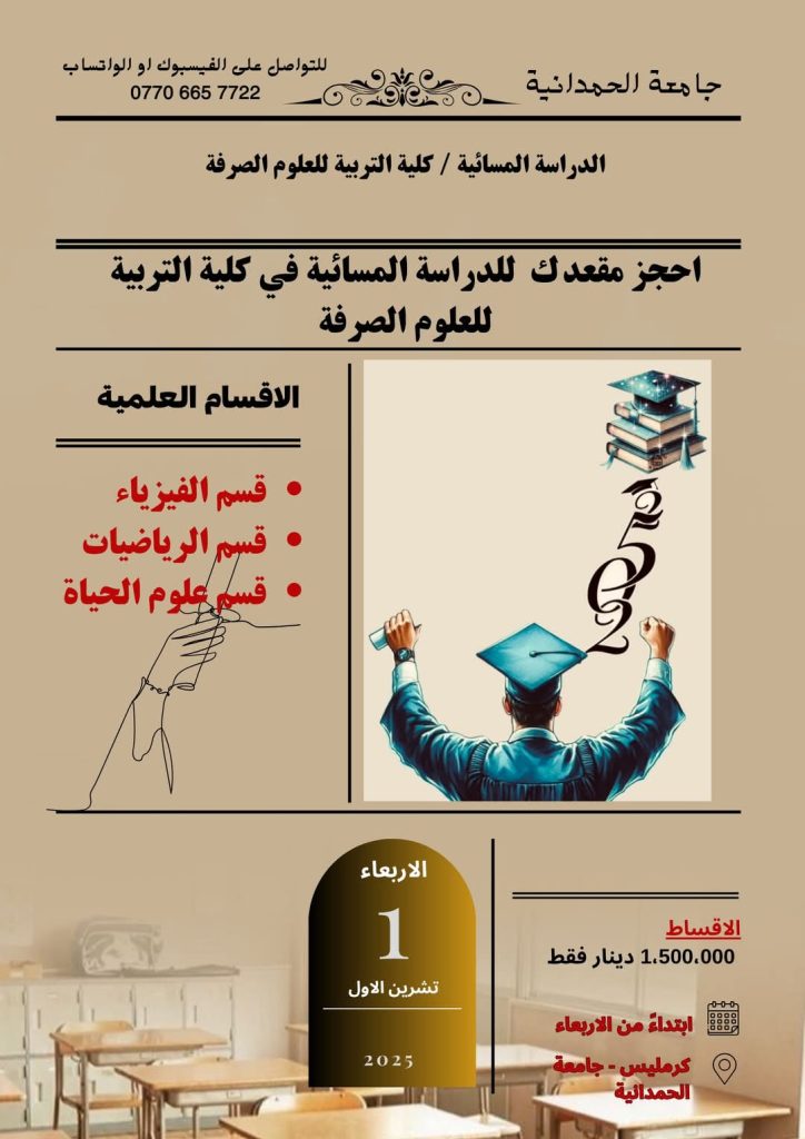 تعلن كلية التربية للعلوم الصرفة في جامعة الحمدانية عن فتح باب التقديم للدراسة المسائية (القناة العامة والمباشر) للعام الدراسي 2025 – 2026، وذلك ابتداءً من يوم الأربعاء الموافق1/ 10/ 2025، استنادًا إلى تعليمات وزارة التعليم العالي والبحث العلمي.ويشمل التقديم الأقسام الآتية: