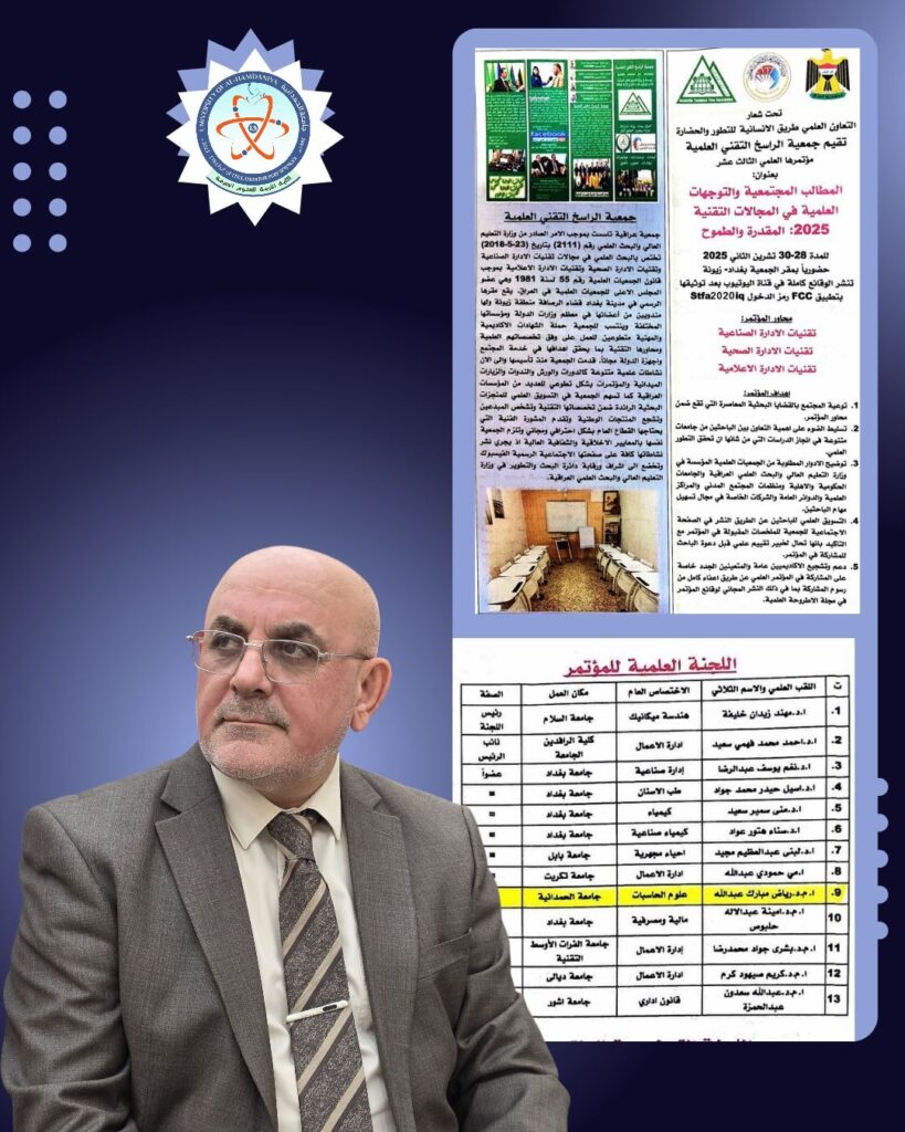 اختير الأستاذ المساعد الدكتور رياض مبارك عبدالله، عميد كلية التربية للعلوم الصرفة في جامعة الحمدانية، عضوًا في لجنة المؤتمر العلمي الثالث عشر الذي تقيمه جمعية الراسخ التقنية العلمية في بغداد للمدة من 28 إلى 30 تشرين الثاني 2025، تحت شعار: