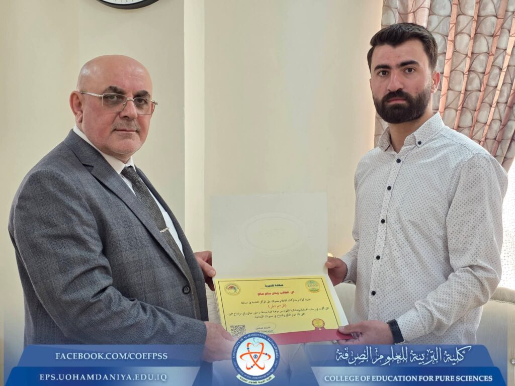 كرّم عميد كلية التربية للعلوم الصرفة في جامعة الحمدانية أ.م.د. رياض مبارك عبدالله الطالب زيدان سالم صالح من قسم الرياضيات / المرحلة الثالثة، وذلك لفوزه في مسابقة الرسم الحر التي نظمتها الكلية ضمن أنشطتها الطلابية.
