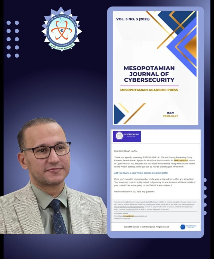 انسجاماً مع الهدف الرابع من أهداف التنمية المستدامة والمتمثل بجودة التعليم، وبإشراف عميد كلية التربية للعلوم الصرفة أ.م.د. رياض مبارك عبدالله، أعلنت الكلية عن تسجيل إنجاز بحثي جديد تمثّل بمشاركة معاون العميد للشؤون العلمية والدراسات العليا المدرس الدكتور محمد عباس كاظم في تقييم بحث علمي لإحدى المجلات العالمية الرصينة المصنّفة ضمن مستوعبات Scopus و Clarivate، والواقعة ضمن الربع الثاني Q2 في تخصص الأمن السيبراني Cybersecurity.