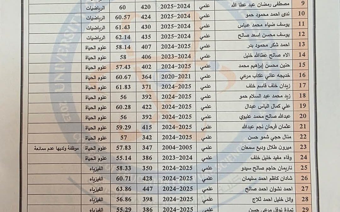 تعلن كلية التربية للعلوم الصرفة / جامعة الحمدانية / شعبة التسجيل للدراسة المسائية 2025_2026 عن اعلان نتائج القبول المركزي للطلبة المدرجة اسماؤهم في القائمة أدناه ، وموزعين بحسب الاقسام التالية ، فعلى الطلبة المقبولين