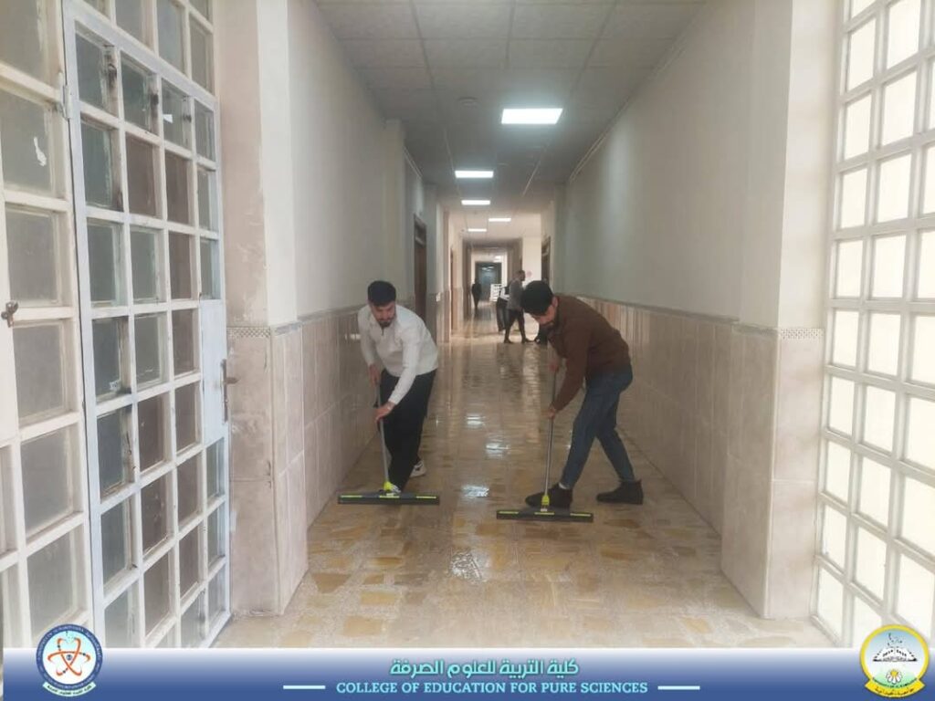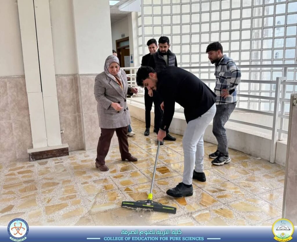 Under the patronage of the President of Al-Hamdaniya University, Professor Dr. Nashat Mubarak Sliwa, and the supervision of the Dean of the College of Education for Pure Sciences, Assistant Professor Dr. Riyadh Mubarak Abdullah, and within the activities of the Department of Biological Sciences, the Department organized a voluntary initiative with the participation of evening study students, under the follow-up of the Head of the Advisory Committee, Assistant Professor Dr. Hawraa Faisal Hasab Allah.The initiative included a campaign to clean classrooms and laboratories, reflecting the students’ sense of responsibility and environmental awareness. It also contributes to promoting the concepts of teamwork and service to the university community. Media and Government Communication Division. college of Education for Pure Sciences