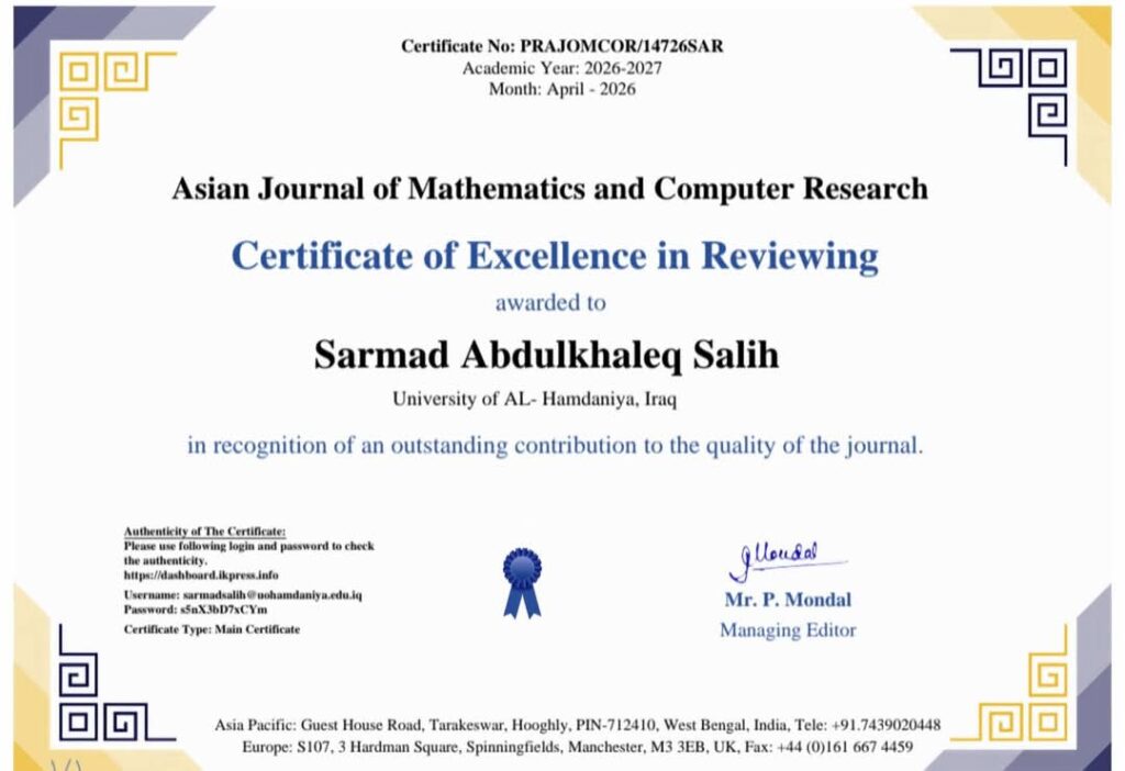 As part of the scientific achievements of the College of Education for Pure Sciences, Assistant Professor Dr. Sarmad Abdulkhaliq Saleh, Head of the Department of Mathematics at the College of Education for Pure Sciences, has evaluated two scientific research papers published in both local and international journals.