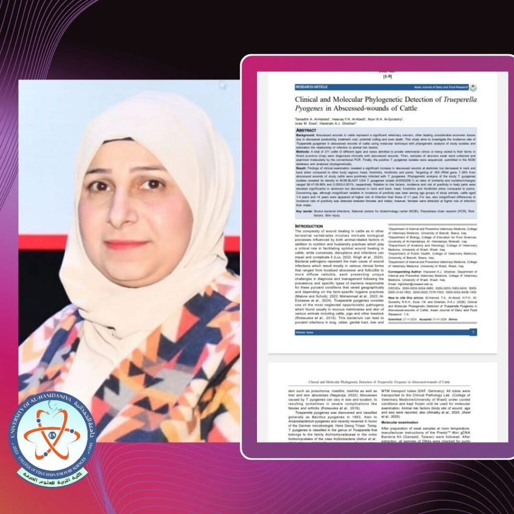 A joint research team from the Department of Life Sciences at our College, in collaboration with the Colleges of Veterinary Medicine at the University of Wasit and the University of Basrah, has achieved a new scientific accomplishment. The study, conducted with the participation of Assistant Professor Dr. Hawraa Faisal Hasbullah, reports—for the first time in Iraq—the identification of the bacterium Trueperella pyogenes using molecular techniques (PCR).The team successfully registered twenty bacterial isolates in the global NCBI GenBank, making this study the first of its kind in cattle to perform molecular characterization of strains isolated from wound suppurations. The study recommends continued surveillance of bacterial strains and the adoption of appropriate health measures to ensure effective treatment.