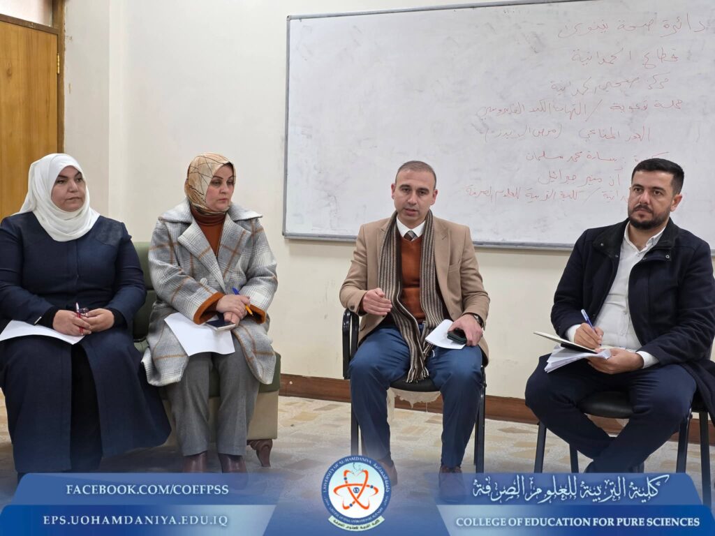The Dean of the College of Education for Pure Sciences, Asst. Prof. Dr. Riyadh Mubarak Abdullah, along with his Scientific and Administrative Assistants, received on Monday, 2 February 2026, the University Performance Evaluation Committee for the Iraqi universities’ ministerial classification, representing the University Presidency. This visit was conducted within the framework of following up on programmatic accreditation reports in the scientific departments.The meeting was attended by the Dean and his assistants, in addition to the heads of scientific departments and officials of several administrative units within the College. During the meeting, the adopted work mechanisms were reviewed, the requirements of the ministerial classification were discussed, and ways to enhance the quality of academic and administrative performance in line with the approved accreditation standards were examined.During the meeting, the Dean emphasized the College’s commitment to adhering to quality assurance and programmatic accreditation standards, as well as its continuous efforts to develop the educational and research processes, in a manner that contributes to enhancing the University’s standing within national rankings.