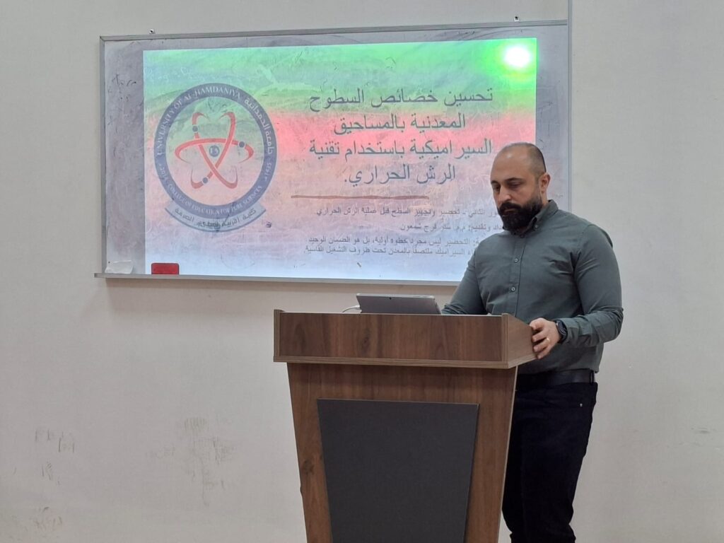 استكمالا لنشاطات قسم الفيزياء للعام الدراسي ٢٠٢٦/٢٠٢٥ وضمن سلسلة الدورات التي يقيمها القسم .يقيم مجموعة من تدريسي القسم دورة بعنوان ( تحسين الخصائص السطوح المعدنية بالمساحيق السيراميكية باستخدام تقنية الرش الحراري) لطلبة المرحلة الثانية والتي يتم من خلالها تعريف المشاركين بتقنية الرش الحراري وكيفية استخدام هذه التقنية في تحسين الخصائص للسطوح المعدنية..